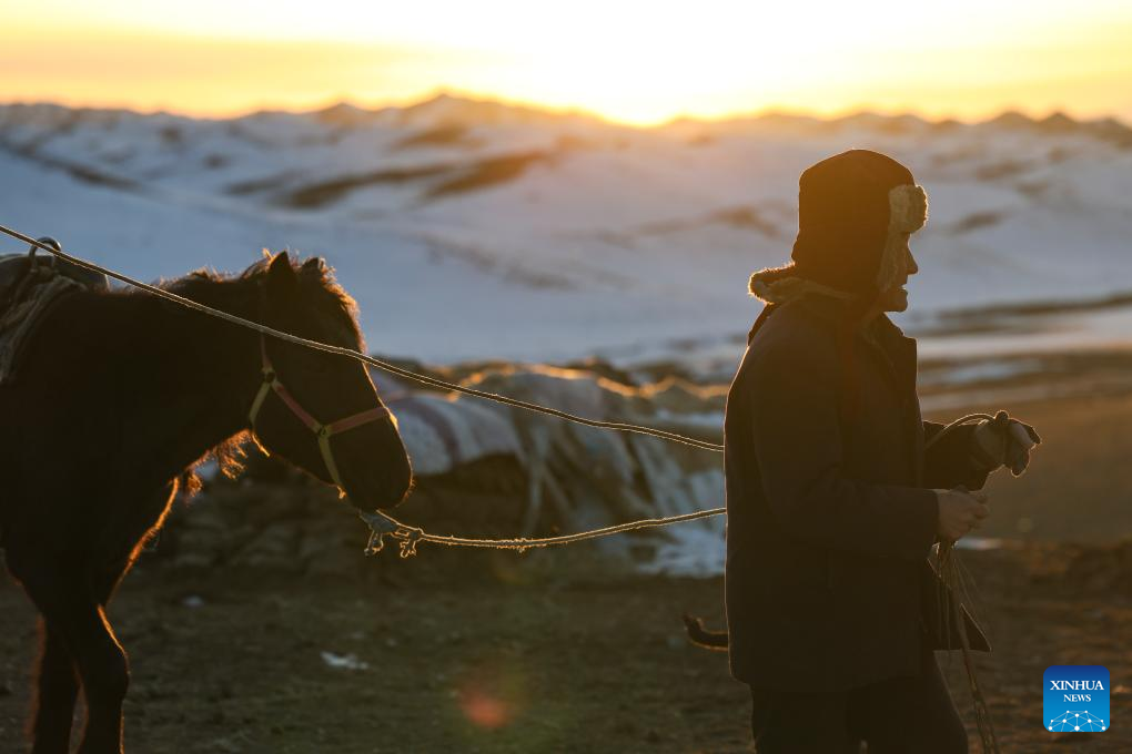 Habudelashen Nusupbek walks his horse at a winter pasture in Yumin County, northwest China's Xinjiang Uygur Autonomous Region, Nov. 29, 2023. (Xinhua/Hu Huhu)