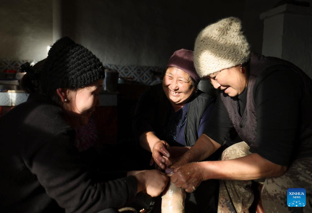 Baht Turlksi (C) fills beef sausages while chatting with her relatives and friends in Yumin County, northwest China's Xinjiang Uygur Autonomous Region, Nov. 30, 2023. (Xinhua/Hu Huhu)