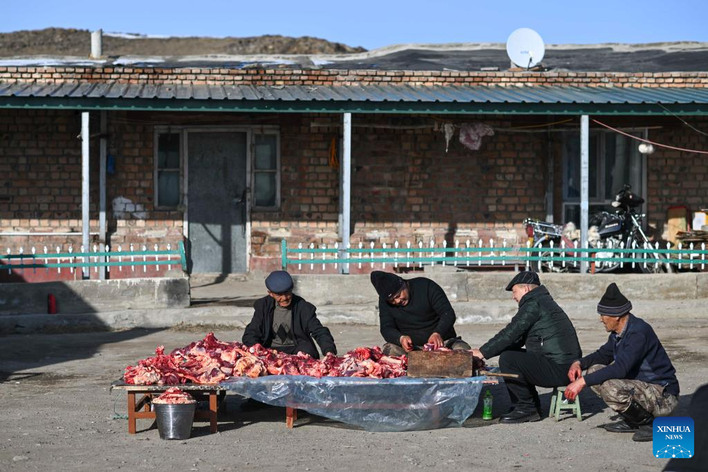 Habudelashen Nusupbek (1st L) cuts beef with his relatives and friends at the yard of his home in Yumin County, northwest China's Xinjiang Uygur Autonomous Region, Nov. 30, 2023. (Xinhua/Hu Huhu)
