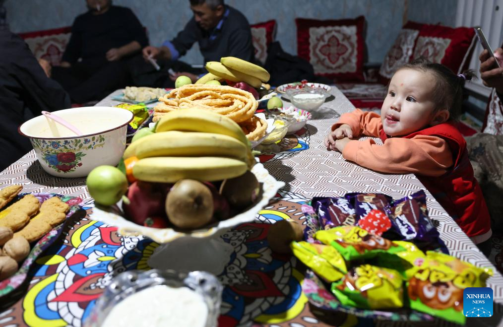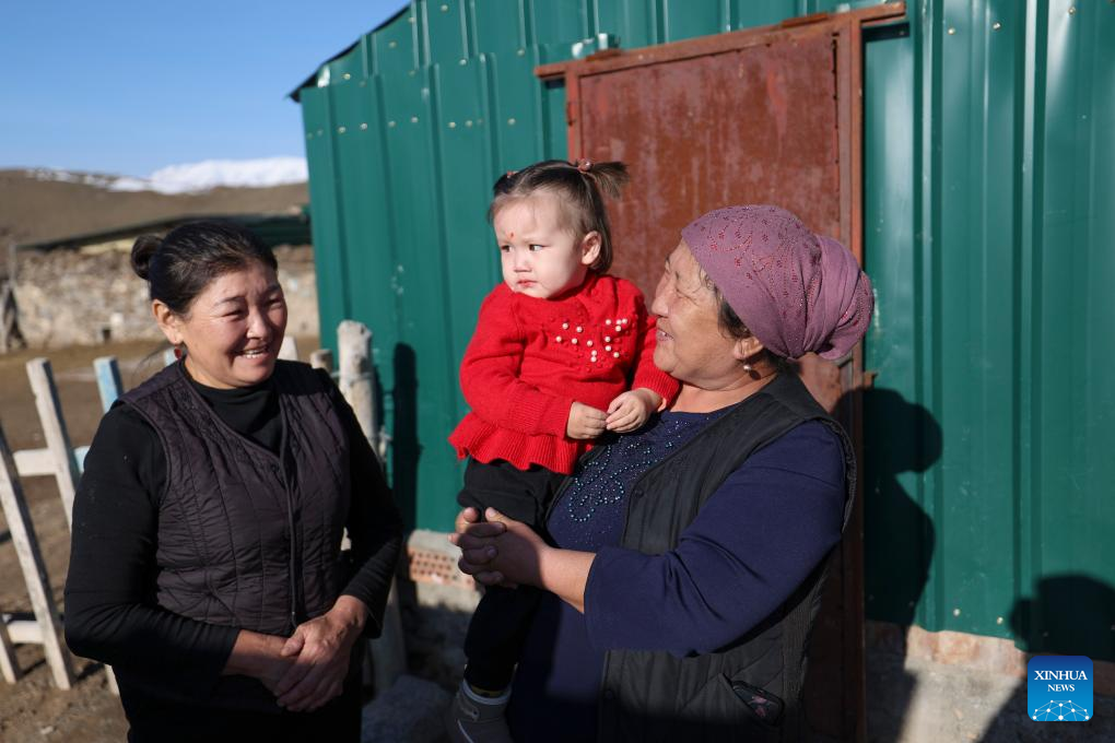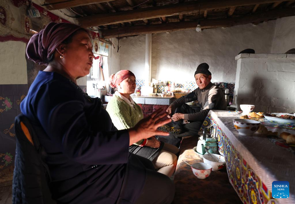 Baht Turlksi (L) chats with the guest (C) in Yumin County, northwest China's Xinjiang Uygur Autonomous Region, Dec. 1, 2023. (Xinhua/Hu Huhu)
