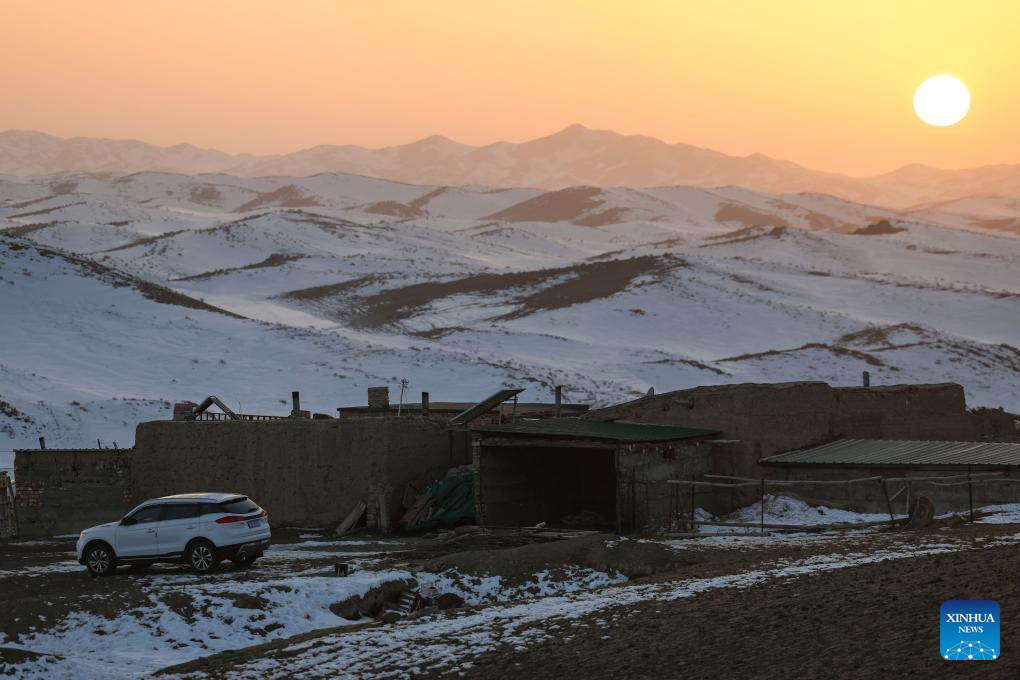 This photo taken on Dec. 1, 2023 shows the residence of Baht Turlksi's family with a vehicle parking beside in Yumin County, northwest China's Xinjiang Uygur Autonomous Region. (Xinhua/Hu Huhu)