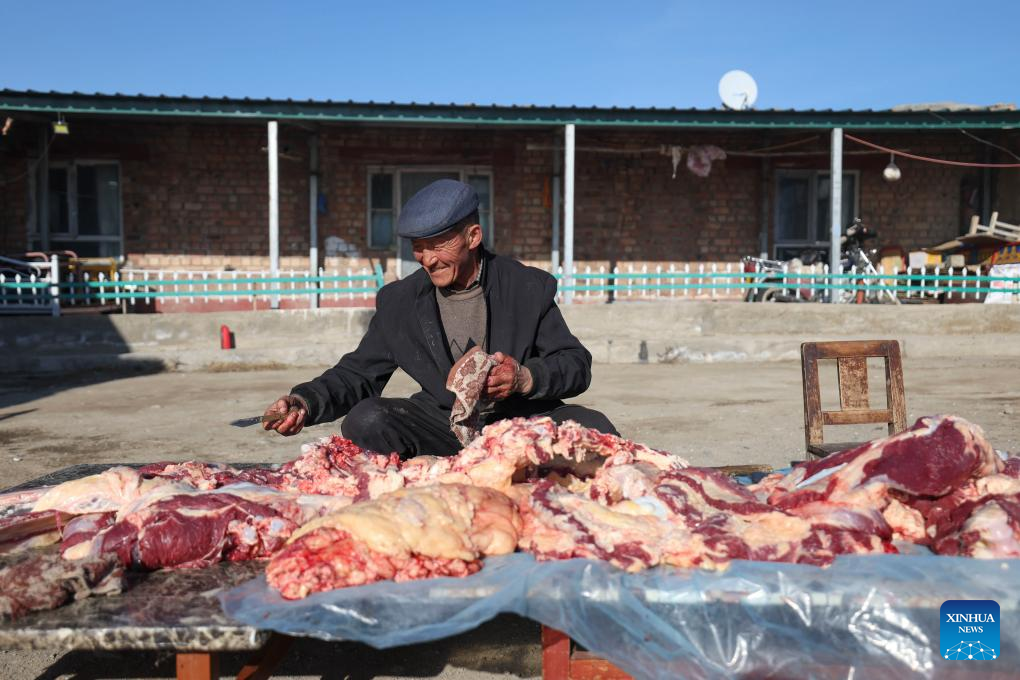 Habudelashen Nusupbek cuts beef at the yard of his home in Yumin County, northwest China's Xinjiang Uygur Autonomous Region, Nov. 30, 2023. (Xinhua/Hu Huhu)