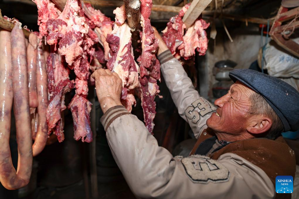 Habudelashen Nusupbek puts corned beef and beef sausages on a drying rack in Yumin County, northwest China's Xinjiang Uygur Autonomous Region, Nov. 30, 2023. (Xinhua/Hu Huhu)