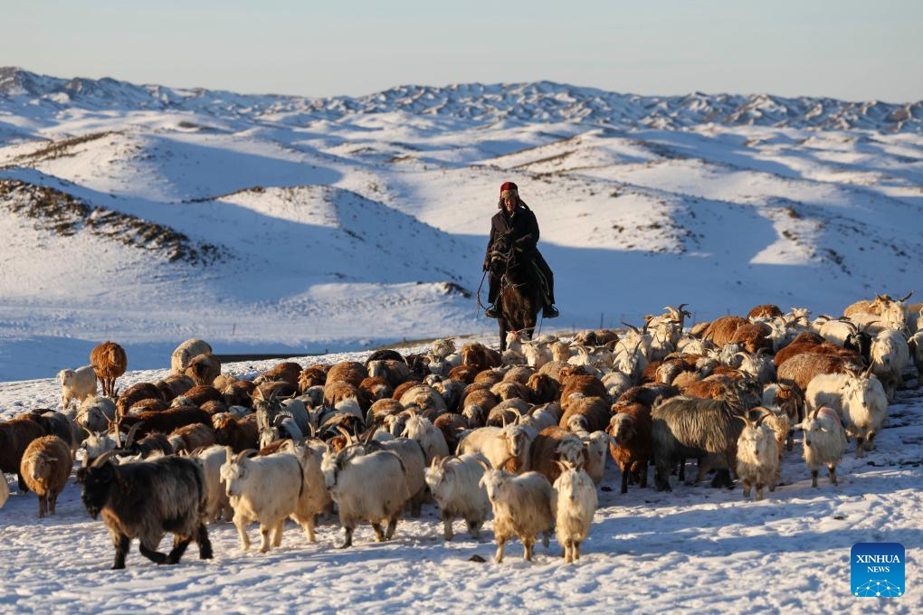 Habudelashen Nusupbek drives goats at a winter pasture in Yumin County, northwest China's Xinjiang Uygur Autonomous Region, Nov. 30, 2023. (Xinhua/Hu Huhu)