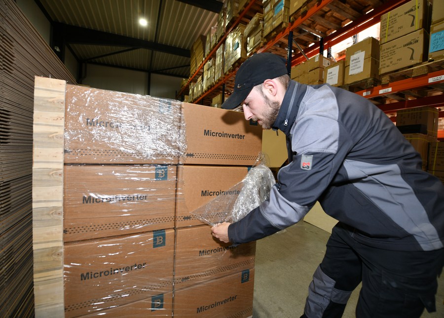 A staff member unwraps the packaging of Chinese-made micro inverters at the warehouse of Lauxx Energy in Ahrensburg, Germany, May 30, 2023. (Xinhua/Ren Pengfei)
