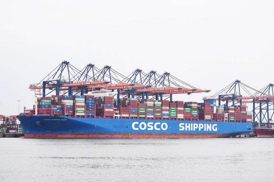 A container ship of China's COSCO Shipping docks at the Port of Rotterdam, the Netherlands, May 1, 2023. (Xinhua/Ren Pengfei)