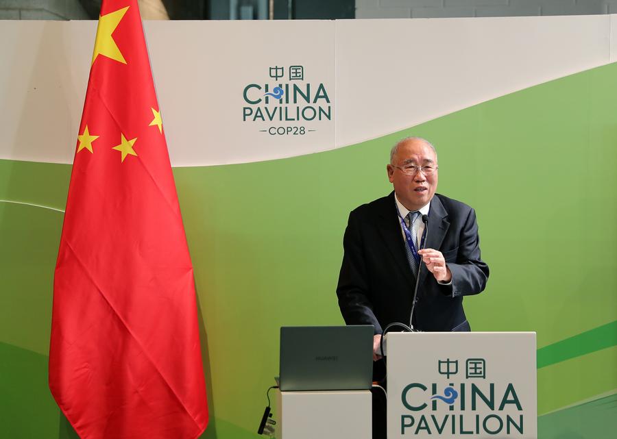 China's special envoy for climate change Xie Zhenhua speaks at a side event held at the China Pavilion of the COP28 climate conference in Dubai, the United Arab Emirates, Dec. 8, 2023. (Xinhua/Wang Dongzhen)