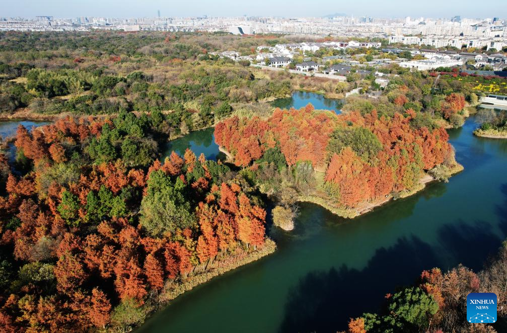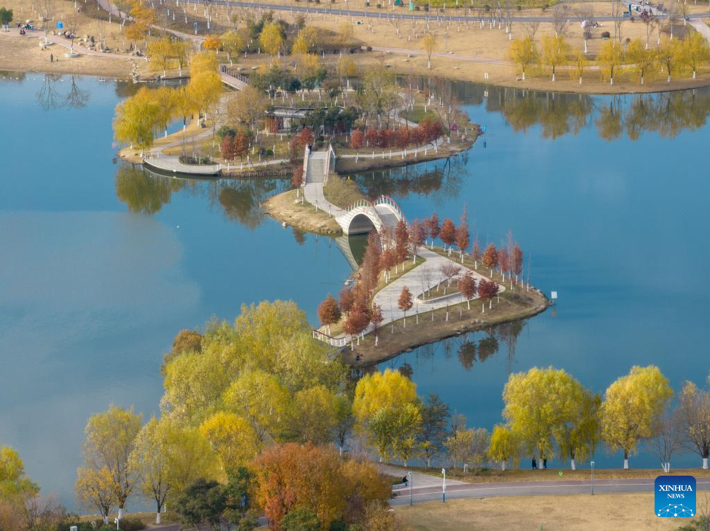 This aerial photo taken on Dec. 9, 2023 shows the scenery at Hemu Lake park in Hefei, east China's Anhui Province. (Photo by Ruan Xuefeng/Xinhua)
