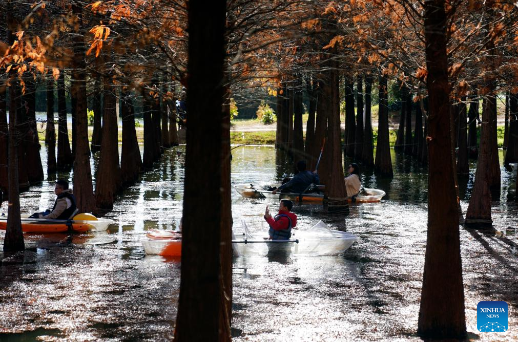 Tourists row boats at Haihong Wetland Park in Kunming, southwest China's Yunnan Province, Dec. 9, 2023. (Photo by Liang Zhiqiang/Xinhua)