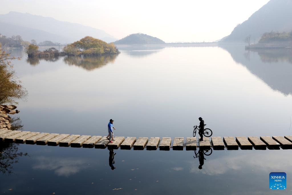 This aerial photo taken on Dec. 9, 2023 shows tourists having fun by the Tangwang Lake in Lianyungang, east China's Jiangsu Province. (Photo by Wang Chun/Xinhua)