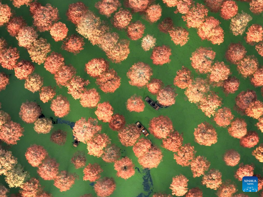 This aerial photo taken on Dec. 9, 2023 shows tourists rowing boats at Luyang Lake wetland park in Yangzhou, east China's Jiangsu Province. (Photo by Meng Delong/Xinhua)