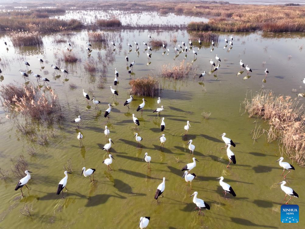 This aerial photo taken on Dec. 9, 2023 shows a flock of oriental white storks foraging at a national ocean park in Lianyungang, east China's Jiangsu Province. (Photo by Wang Chun/Xinhua)