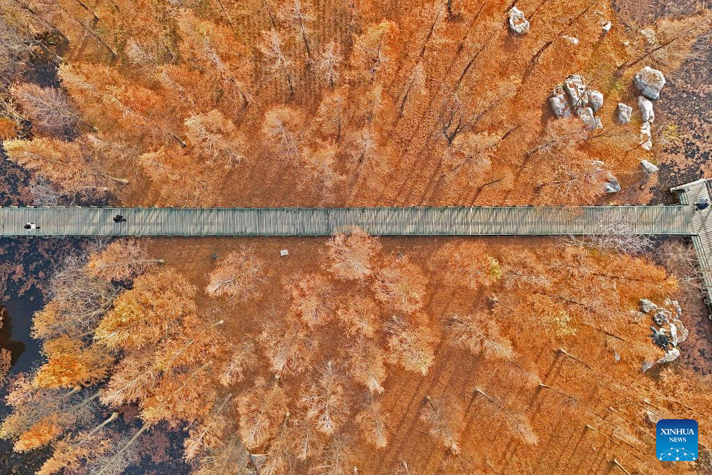 This aerial photo taken on Dec. 9, 2023 shows tourists visiting a wetland park in Yantai, east China's Shandong Province. (Photo by Sun Wentan/Xinhua)