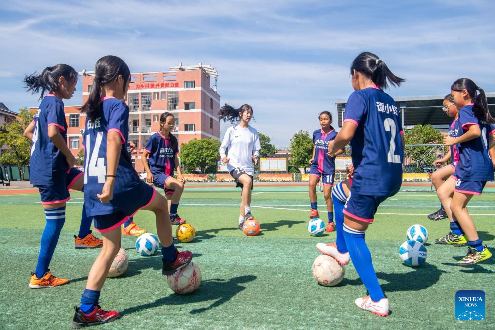 Qin Furong (4th L) instructs girls of a football team in practice in Shizhu Tujia Autonomous County, southwest China's Chongqing Municipality, Sept. 1, 2023. (Xinhua/Tang Yi)