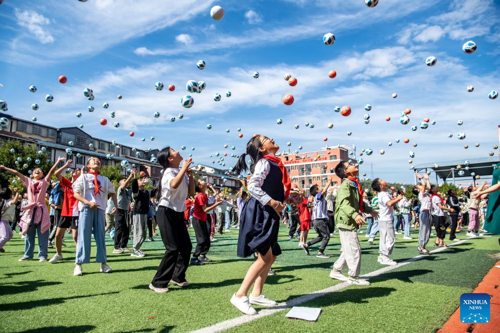 Students throw footballs into the sky during the opening ceremony for a new semester at Sanhe Town Primary School in Shizhu Tujia Autonomous County, southwest China's Chongqing Municipality, Sept. 1, 2023. (Xinhua/Tang Yi)
