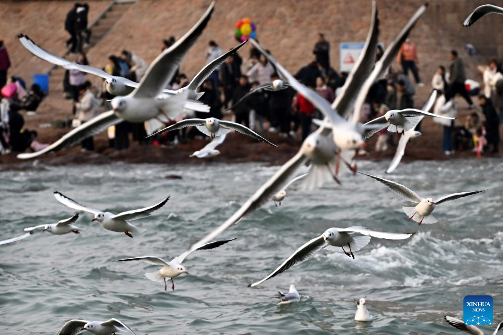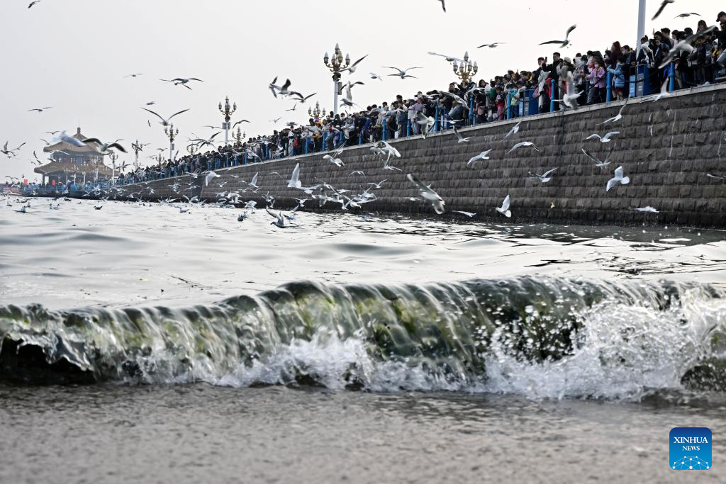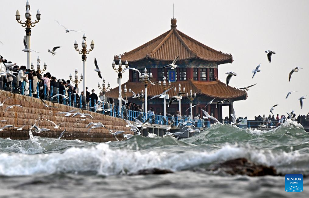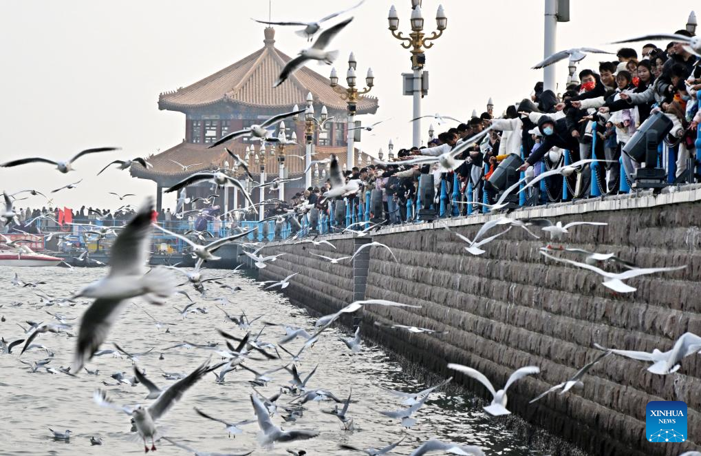 People watch seagulls at the Zhanqiao Bridge scenic spot in Qingdao, a coastal city in east China's Shandong Province, Dec. 9, 2023. (Xinhua/Li Ziheng)