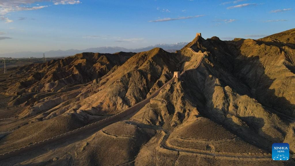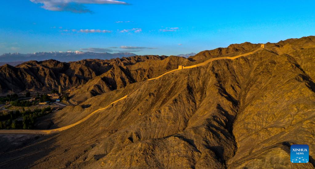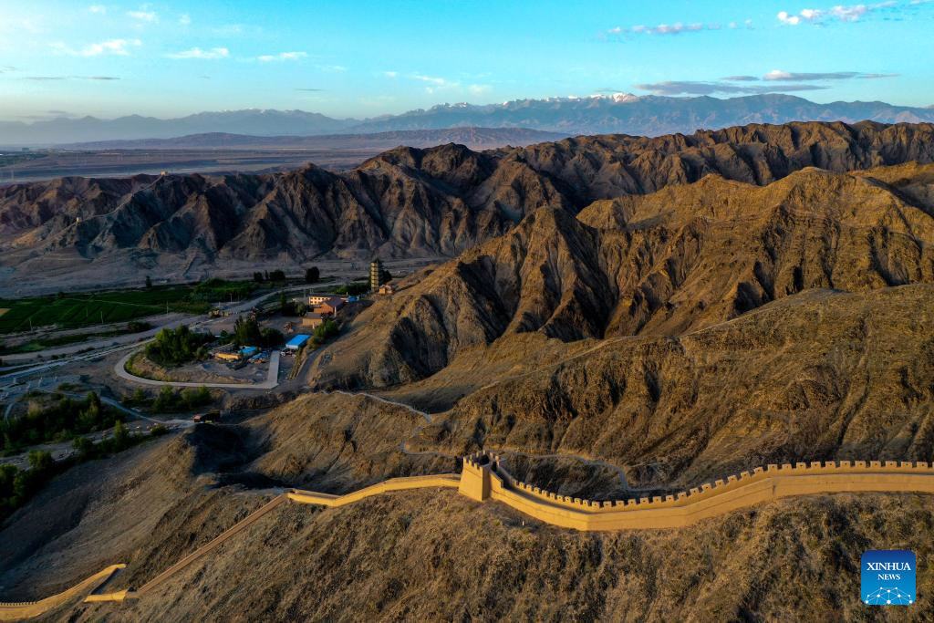 A part of the Great Wall is seen in Yemawan village of Xincheng township, Jiayuguan City, northwest China's Gansu Province, July 14, 2023. Gansu Province is home to multiple sections of the Great Wall that add up to 3,654 kilometers in length. The Hexi Corridor, a critical part of the ancient Silk Road winding through south of the province, boasts more than 1,400 kilometers of the Wall built in the Han Dynasty (202 BC-220 AD), and over 1,200 kilometers erected in the Ming Dynasty (1368-1644). Gansu is therefore dubbed "an open-air museum of the Great Wall." (Xinhua/Liu Jinhai)