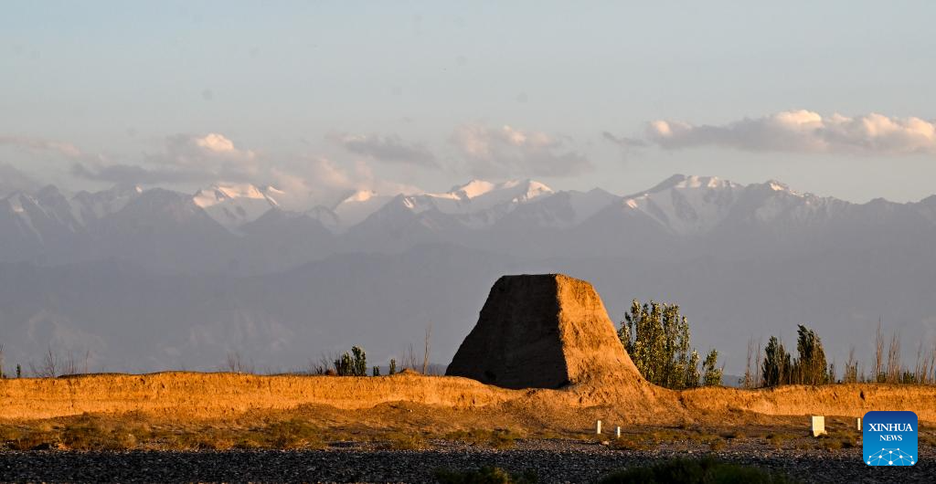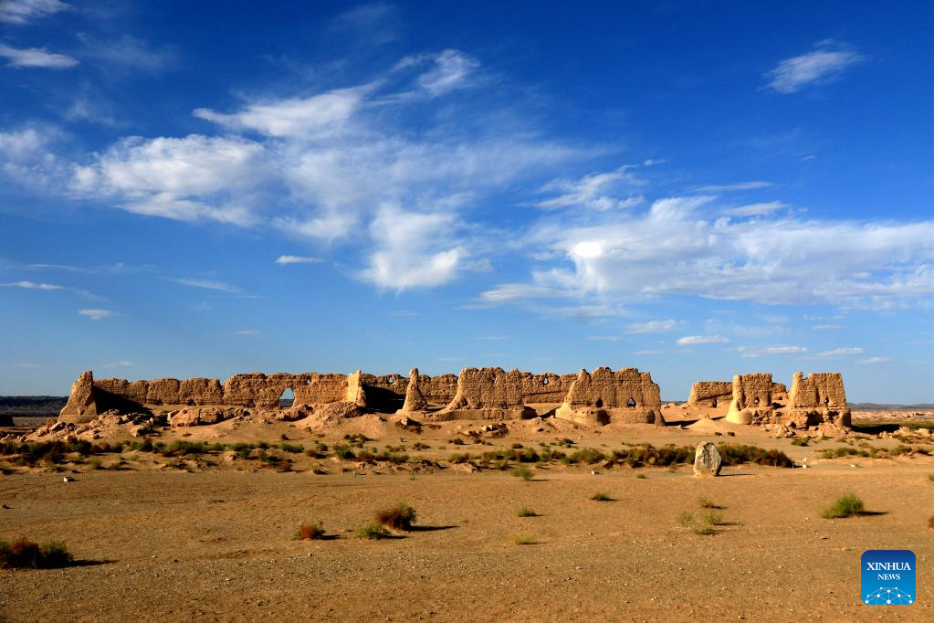 This photo taken on Sept. 6, 2022 shows the Hecangcheng relic site in Dunhuang, northwest China's Gansu Province. Gansu Province is home to multiple sections of the Great Wall that add up to 3,654 kilometers in length. The Hexi Corridor, a critical part of the ancient Silk Road winding through south of the province, boasts more than 1,400 kilometers of the Wall built in the Han Dynasty (202 BC-220 AD), and over 1,200 kilometers erected in the Ming Dynasty (1368-1644). Gansu is therefore dubbed "an open-air museum of the Great Wall." (Photo by Zhang Xiaoliang/Xinhua)