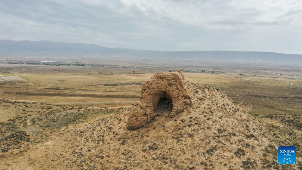 This aerial photo taken on May 16, 2023 shows a worn-out watchtower of the Great Wall in Shandan County of Zhangye City, northwest China's Gansu Province. Gansu Province is home to multiple sections of the Great Wall that add up to 3,654 kilometers in length. The Hexi Corridor, a critical part of the ancient Silk Road winding through south of the province, boasts more than 1,400 kilometers of the Wall built in the Han Dynasty (202 BC-220 AD), and over 1,200 kilometers erected in the Ming Dynasty (1368-1644). Gansu is therefore dubbed "an open-air museum of the Great Wall." (Xinhua/Chen Bin)