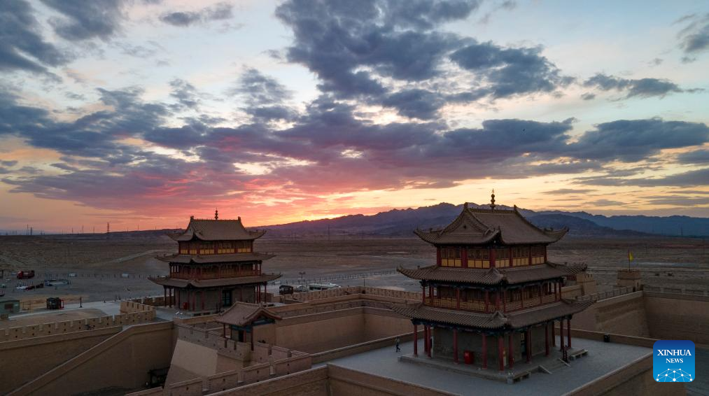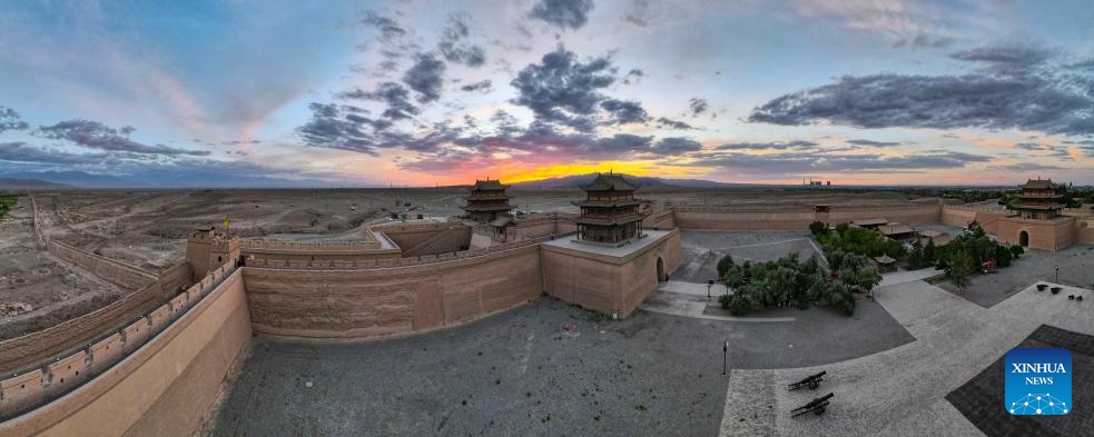This aerial panoramic photo taken on July 13, 2023 shows Jiayu Pass, a famed part of the Great Wall, in Jiayuguan City, northwest China's Gansu Province. Gansu Province is home to multiple sections of the Great Wall that add up to 3,654 kilometers in length. The Hexi Corridor, a critical part of the ancient Silk Road winding through south of the province, boasts more than 1,400 kilometers of the Wall built in the Han Dynasty (202 BC-220 AD), and over 1,200 kilometers erected in the Ming Dynasty (1368-1644). Gansu is therefore dubbed "an open-air museum of the Great Wall." (Xinhua/Chen Zhonghao)