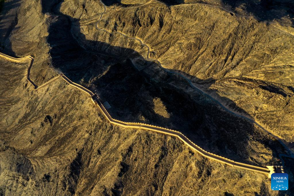 This aerial photo taken on July 15, 2023 shows a part of the Great Wall in Jiayuguan City, northwest China's Gansu Province. Gansu Province is home to multiple sections of the Great Wall that add up to 3,654 kilometers in length. The Hexi Corridor, a critical part of the ancient Silk Road winding through south of the province, boasts more than 1,400 kilometers of the Wall built in the Han Dynasty (202 BC-220 AD), and over 1,200 kilometers erected in the Ming Dynasty (1368-1644). Gansu is therefore dubbed "an open-air museum of the Great Wall." (Xinhua/Liu Jinhai)