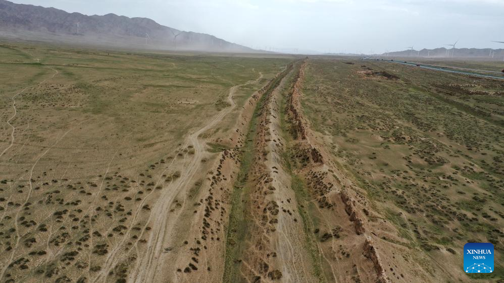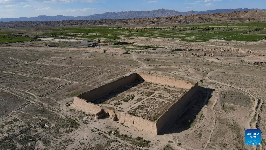 This aerial photo taken on July 15, 2023 shows a relic site in Shandan County of Zhangye City, northwest China's Gansu Province. Gansu Province is home to multiple sections of the Great Wall that add up to 3,654 kilometers in length. The Hexi Corridor, a critical part of the ancient Silk Road winding through south of the province, boasts more than 1,400 kilometers of the Wall built in the Han Dynasty (202 BC-220 AD), and over 1,200 kilometers erected in the Ming Dynasty (1368-1644). Gansu is therefore dubbed "an open-air museum of the Great Wall." (Xinhua/Chen Zhonghao)
