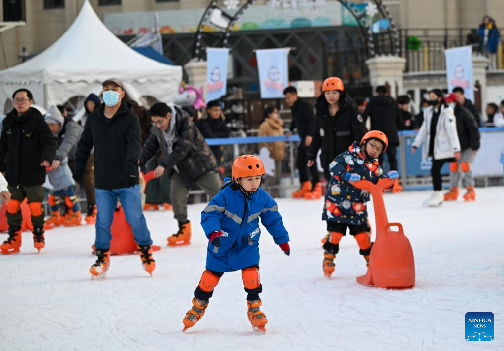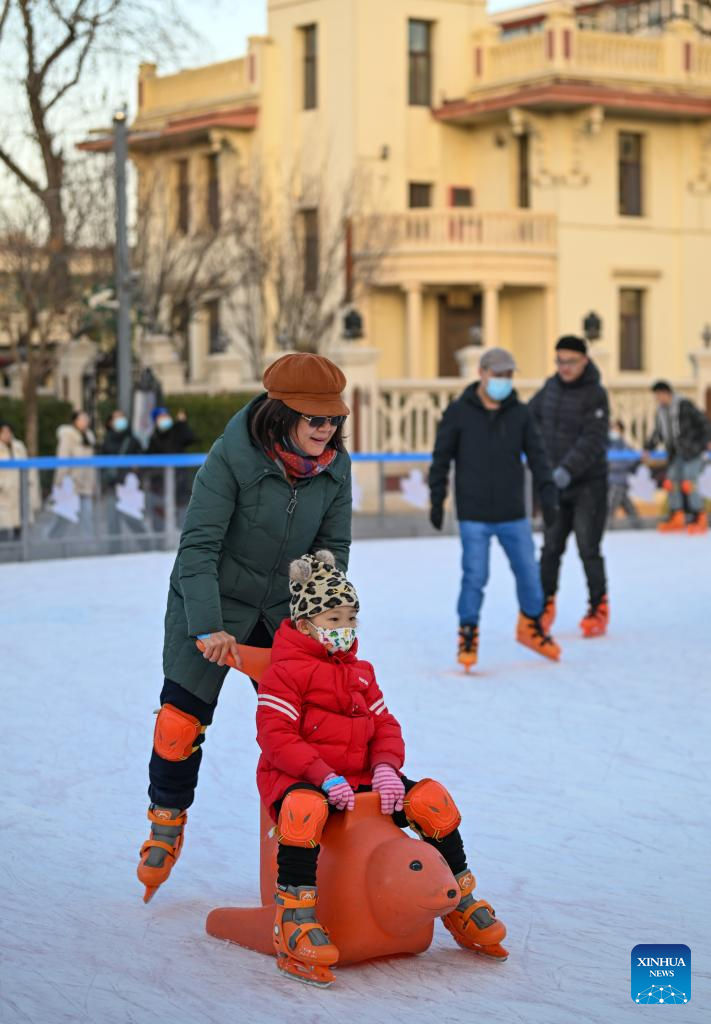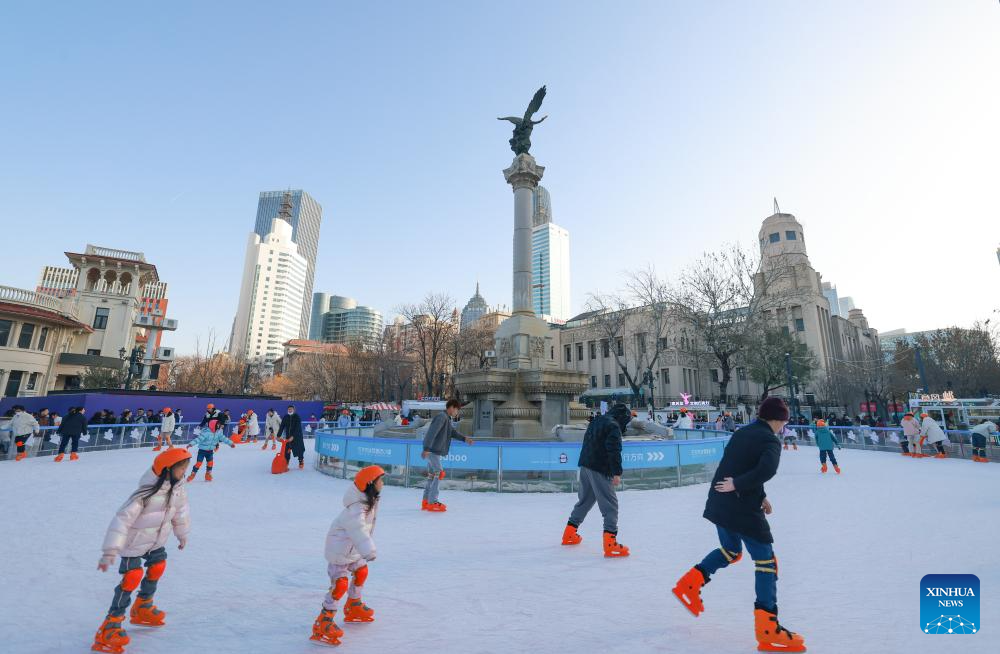 People skate at an ice rink in a public square of the Italian Style Area in Tianjin, north China, Dec. 9, 2023. The ice rink in downtown Tianjin's Italian-Style Area opened to the public Saturday, as a way to boost local winter tourism industry. (Xinhua/Sun Fanyue)