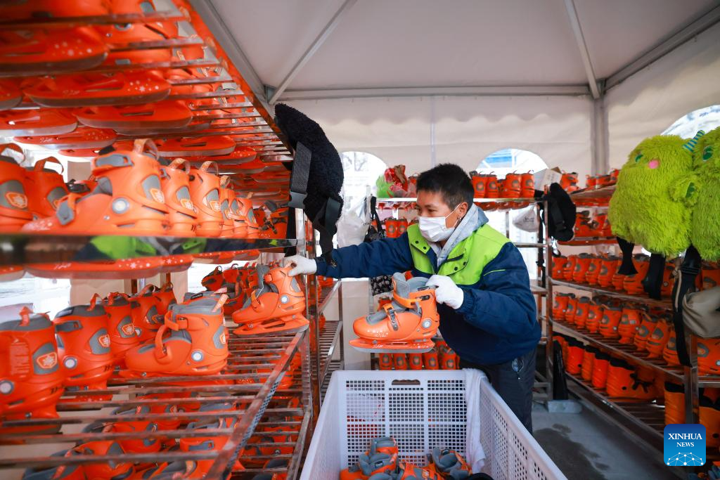 A staff member puts skates in place at an ice rink in a public square of the Italian Style Area in Tianjin, north China, Dec. 9, 2023. The ice rink in downtown Tianjin's Italian-Style Area opened to the public Saturday, as a way to boost local winter tourism industry. (Xinhua/Sun Fanyue)