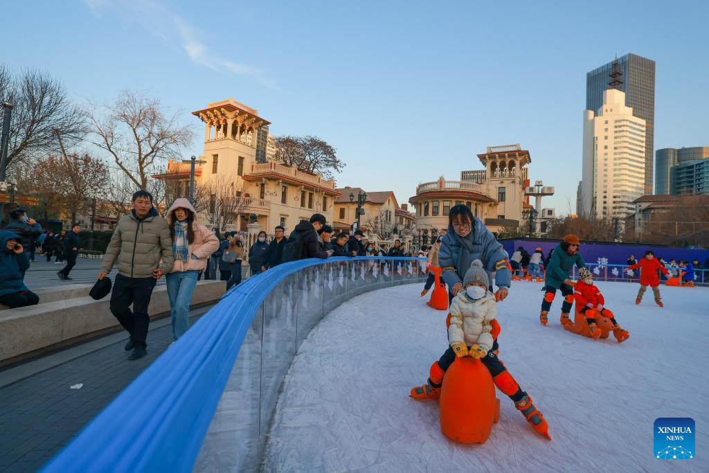 People have fun at an ice rink in a public square of the Italian Style Area in Tianjin, north China, Dec. 9, 2023. The ice rink in downtown Tianjin's Italian-Style Area opened to the public Saturday, as a way to boost local winter tourism industry. (Xinhua/Sun Fanyue)