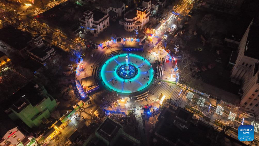 This aerial photo shows an ice rink in a public square of the Italian Style Area in Tianjin, north China, Dec. 9, 2023. The ice rink in downtown Tianjin's Italian-Style Area opened to the public Saturday, as a way to boost local winter tourism industry. (Xinhua/Sun Fanyue)