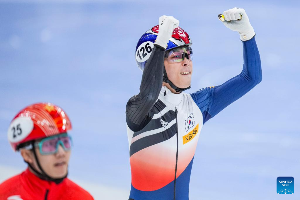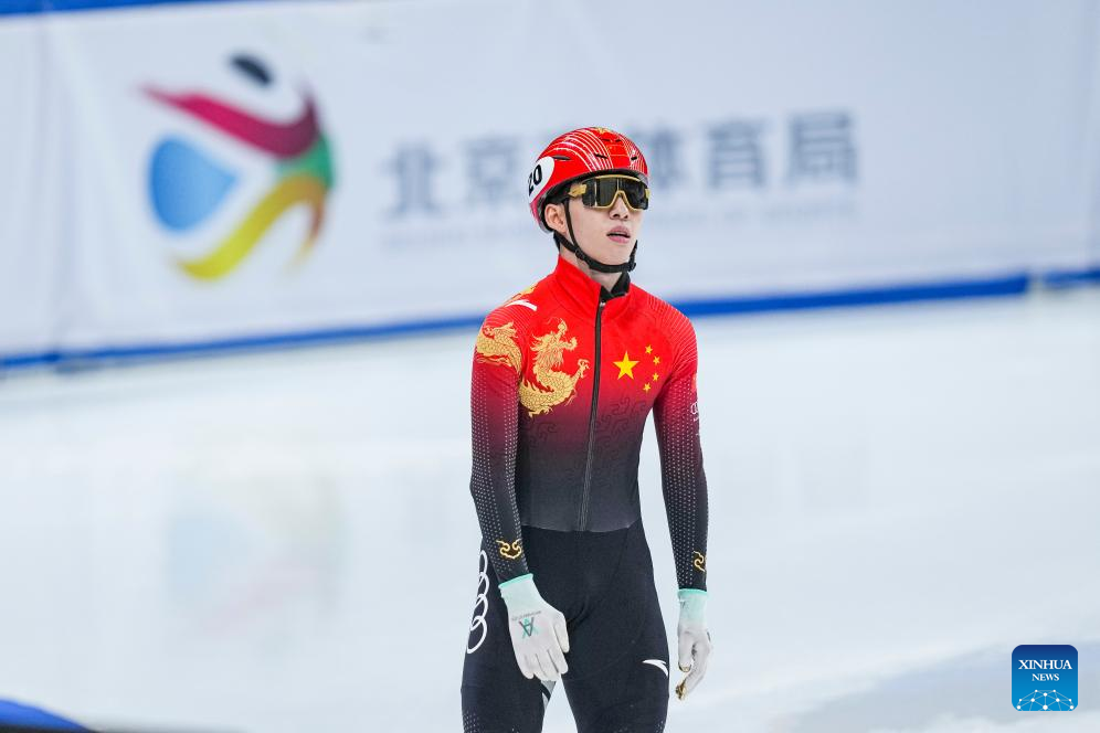 Lin Xiaojun of China reacts after the men's 500m final at the ISU World Cup Short Track Speed Skating series in Beijing, China, Dec. 9, 2023. (Xinhua/Sun Fei)
