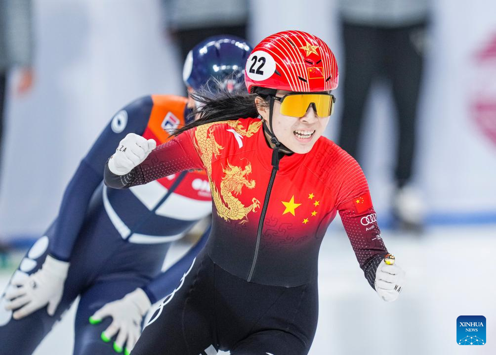 Gong Li of China celebrates after the women's 1500m final at the ISU World Cup Short Track Speed Skating series in Beijing, China, Dec. 9, 2023. (Xinhua/Sun Fei)