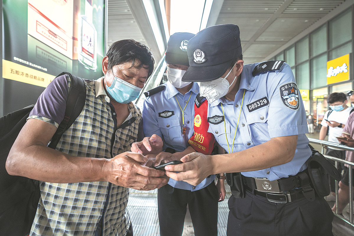 Police officers help a resident in need. [XU CHENG/FOR CHINA DAILY]