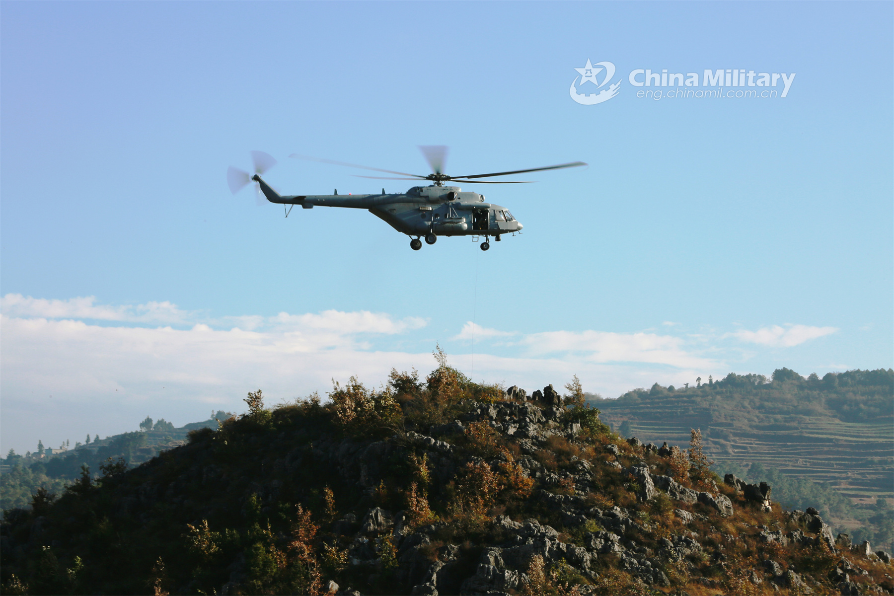 A helicopter attached to an aviation brigade with the air force under the PLA Southern Theater Command hovers above a hill during a search and rescue training exercise held on November 1, 2023. (eng.chinamil.com.cn/Photo by Lei Jian)