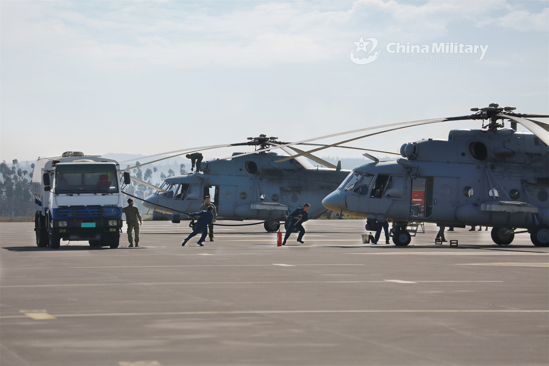 The ground crew assigned to an aviation brigade with the air force under the PLA Southern Theater Command work in team to refuel a helicopter during a search and rescue training exercise held on November 2, 2023. (eng.chinamil.com.cn/Photo by Lei Jian)