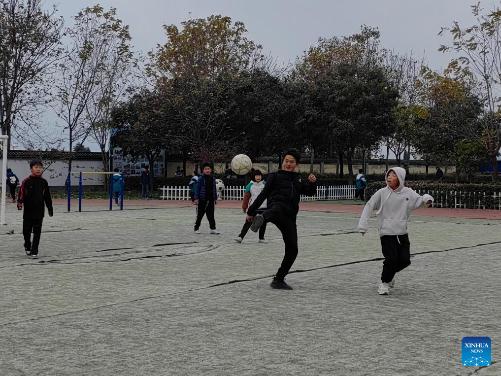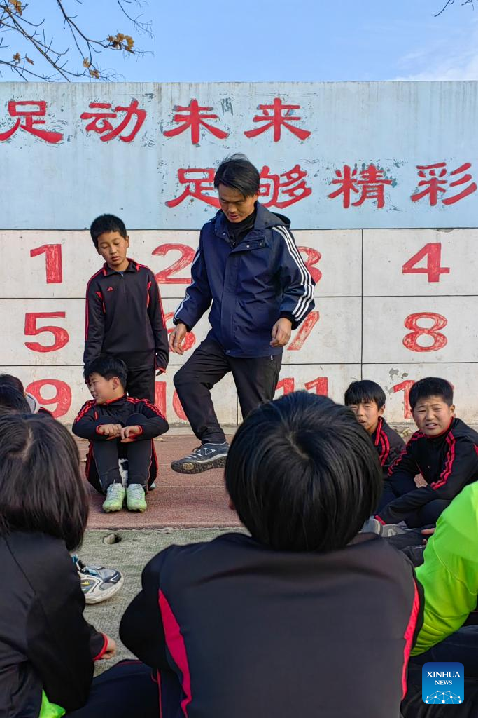 XI'AN, Dec. 9 (Xinhua) -- Wearing a whistle around his neck, Zhu Xiaolong, 35, was providing football coaching to 14 students of a primary school in northwest China's Shaanxi Province when the school bell unexpectedly rang. Swiftly returning to the classroom, he grabbed a ruler and switched to his other role.