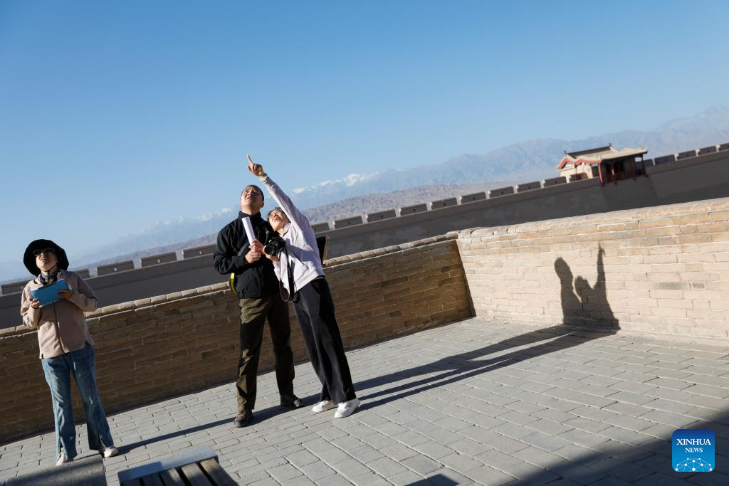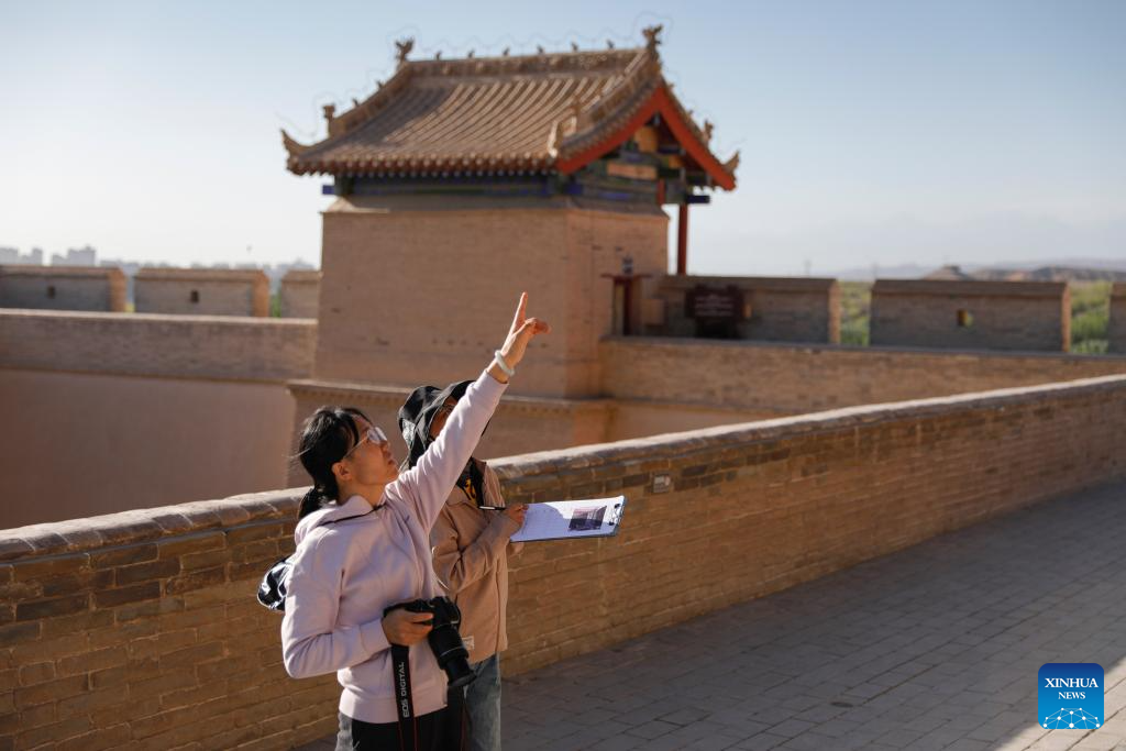 Liu Junjun (R), an associate researcher from the cultural heritage monitoring center of Jiayuguan Silk Road (the Great Wall) cultural research institute, patrols the Jiayu Pass scenic area with colleagues in Jiayuguan City, northwest China's Gansu Province, July 14, 2023. In recent years, cultural heritage protection institutions have increased the investment in the technological protection of the Great Wall. Institutions utilize technological equipment to collect data, analyze metrics and detect any possible damage. These methods guarantee the implementation of effective preservation and restoration measures in time and the Great Wall well-preserved. (Xinhua/Liu Jinhai)
