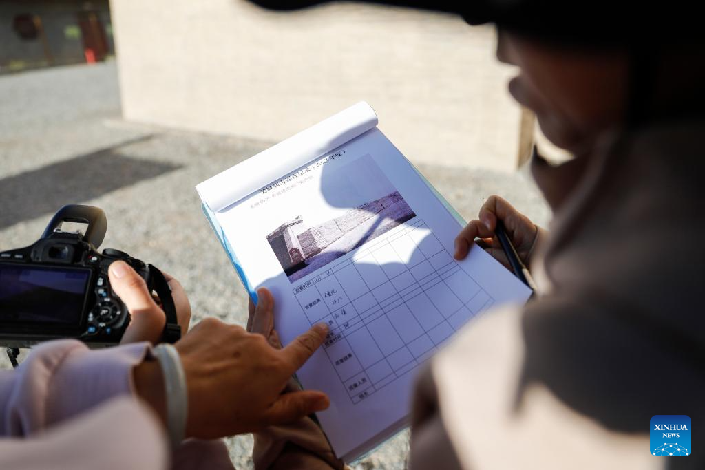 Liu Junjun (L), an associate researcher from the cultural heritage monitoring center of Jiayuguan Silk Road (the Great Wall) cultural research institute, records patrolling results with a colleague at the Jiayu Pass scenic area in Jiayuguan City, northwest China's Gansu Province, July 14, 2023. In recent years, cultural heritage protection institutions have increased the investment in the technological protection of the Great Wall. Institutions utilize technological equipment to collect data, analyze metrics and detect any possible damage. These methods guarantee the implementation of effective preservation and restoration measures in time and the Great Wall well-preserved. (Xinhua/Liu Jinhai)