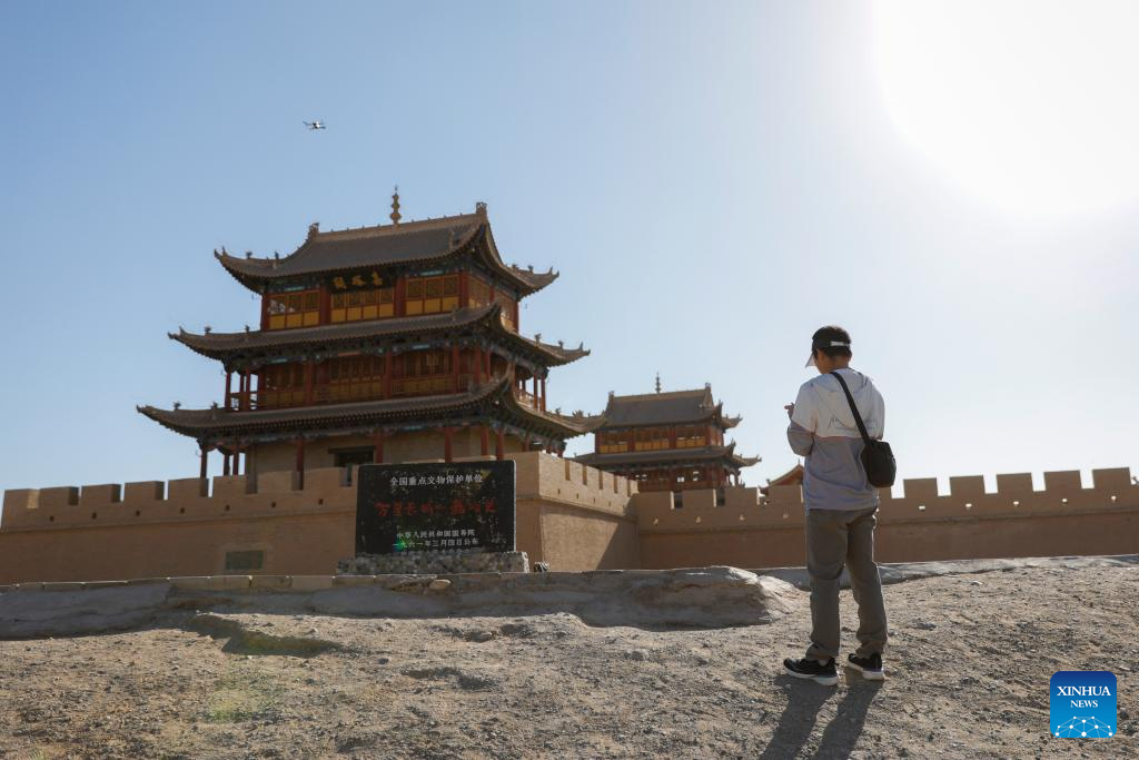 Liu Junjun, an associate researcher from the cultural heritage monitoring center of Jiayuguan Silk Road (the Great Wall) cultural research institute, patrols the Jiayu Pass scenic area in Jiayuguan City, northwest China's Gansu Province, July 14, 2023. In recent years, cultural heritage protection institutions have increased the investment in the technological protection of the Great Wall. Institutions utilize technological equipment to collect data, analyze metrics and detect any possible damage. These methods guarantee the implementation of effective preservation and restoration measures in time and the Great Wall well-preserved. (Xinhua/Liu Jinhai)