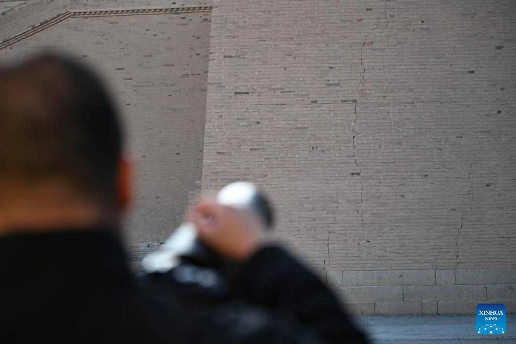 Gao Shang, an engineer from the cultural heritage monitoring center of Jiayuguan Silk Road (the Great Wall) cultural research institute, monitors the changes of cracks on Jiayuguan section of the Great Wall in Jiayuguan City, northwest China's Gansu Province, July 14, 2023. In recent years, cultural heritage protection institutions have increased the investment in the technological protection of the Great Wall. Institutions utilize technological equipment to collect data, analyze metrics and detect any possible damage. These methods guarantee the implementation of effective preservation and restoration measures in time and the Great Wall well-preserved. (Xinhua/Chen Zhonghao)