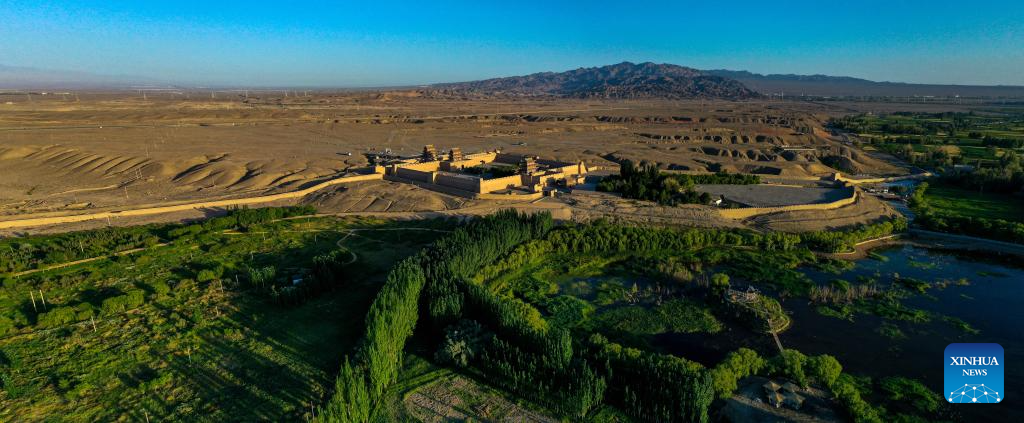 This stitched aerial photo taken on July 14, 2023 shows a view of the Jiayu Pass scenic area in Jiayuguan City, northwest China's Gansu Province. In recent years, cultural heritage protection institutions have increased the investment in the technological protection of the Great Wall. Institutions utilize technological equipment to collect data, analyze metrics and detect any possible damage. These methods guarantee the implementation of effective preservation and restoration measures in time and the Great Wall well-preserved. (Xinhua/Liu Jinhai)