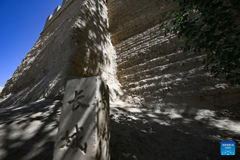 This photo taken on July 13, 2023 shows a part of reinforced wall in Jiayuguan City, northwest China's Gansu Province. In recent years, cultural heritage protection institutions have increased the investment in the technological protection of the Great Wall. Institutions utilize technological equipment to collect data, analyze metrics and detect any possible damage. These methods guarantee the implementation of effective preservation and restoration measures in time and the Great Wall well-preserved. (Xinhua/Chen Zhonghao)