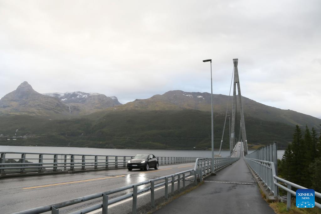 A van runs on the Halogaland Bridge near Norway's northern port city of Narvik, on Sept. 4, 2023. (Xinhua/Zhang Yuliang)
