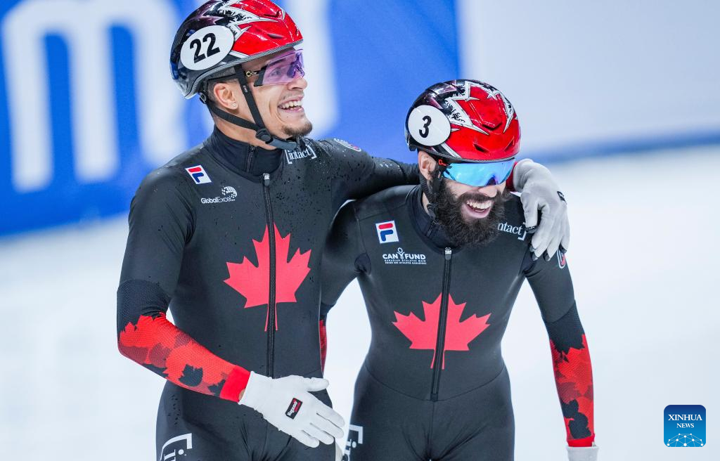 Jordan Pierre-Gilles (L) and Steven Dubois of Canada celebrate after the men's 500m(2) final at the ISU World Cup Short Track Speed Skating series in Beijing, China, Dec. 10, 2023. (Xinhua/Sun Fei)