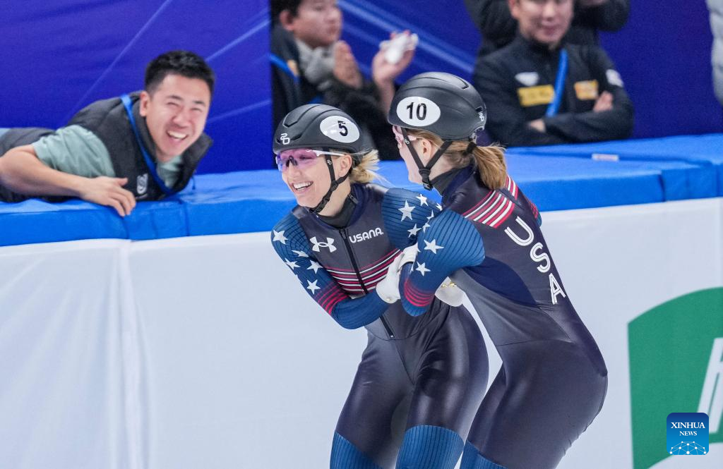 Kristen Santos-Griswold (L) and Corinne Stoddard of the United States celebrate after the women's 1000m final at the ISU World Cup Short Track Speed Skating series in Beijing, China, Dec. 10, 2023. (Xinhua/Sun Fei)