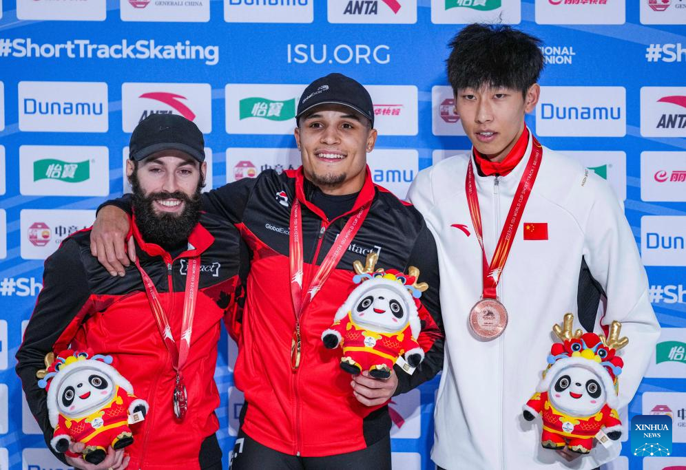 Gold medalist Jordan Pierre-Gilles (C) of Canada, silver medalist Steven Dubois (L) of Canada and bronze medalist Sun Long of China pose during the awarding ceremony for the men's 500m(2) event at the ISU World Cup Short Track Speed Skating series in Beijing, China, Dec. 10, 2023. (Xinhua/Sun Fei)
