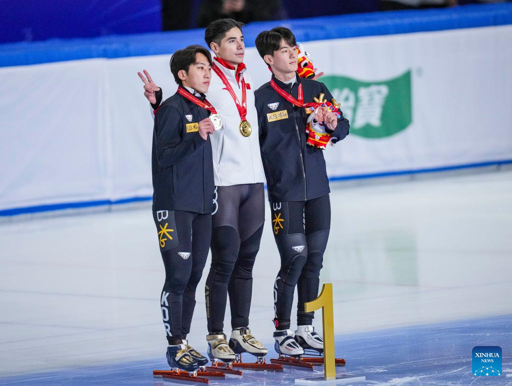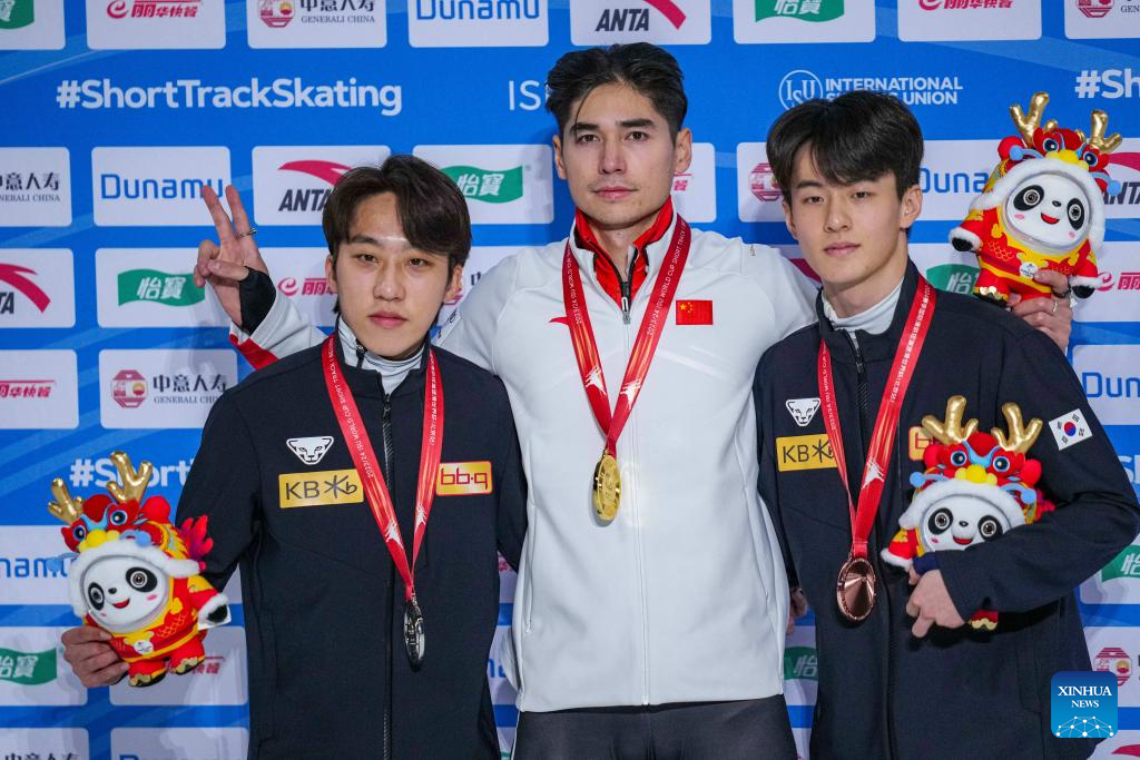 Gold medalist Liu Shaoang (C) of China, silver medalist Park Ji Won (L) of South Korea and bronze medalist Jang Sungwoo of South Korea pose during the awarding ceremony for the men's 1000m event at the ISU World Cup Short Track Speed Skating series in Beijing, China, Dec. 10, 2023. (Xinhua/Sun Fei)