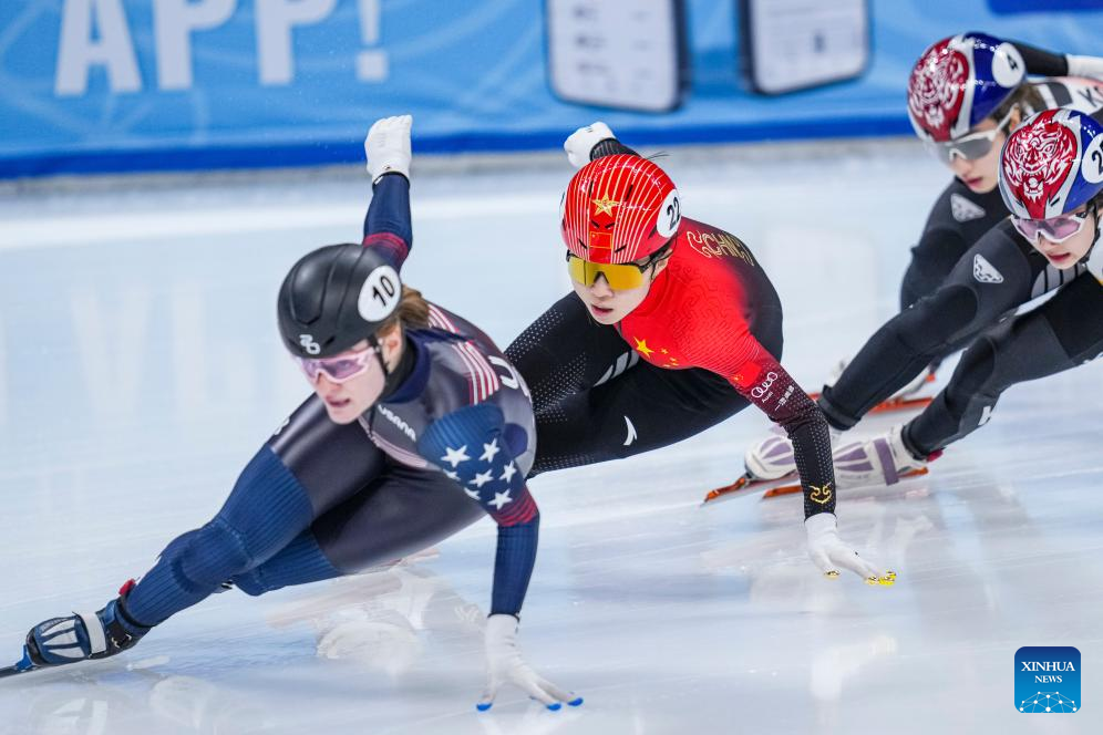 Gong Li (2nd L) of China competes during the women's 1000m final at the ISU World Cup Short Track Speed Skating series in Beijing, China, Dec. 10, 2023. (Xinhua/Sun Fei)