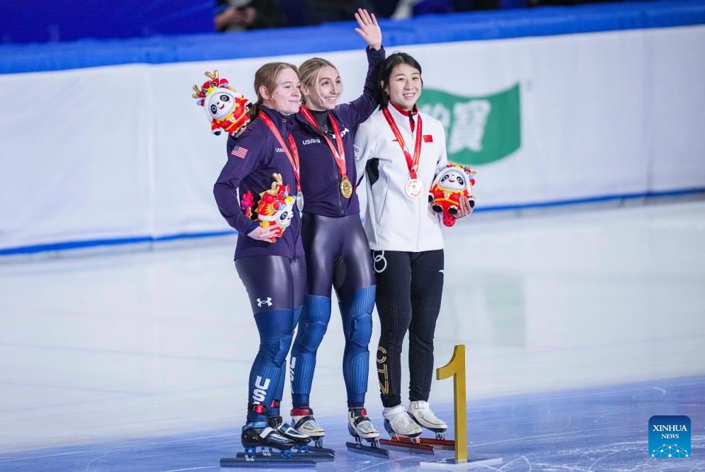 Gold medalist Kristen Santos-Griswold (C) of the United States, silver medalist Corinne Stoddard (L) of the United States and bronze medalist Gong Li of China celebrate during the awarding ceremony for the women's 1000m event at the ISU World Cup Short Track Speed Skating series in Beijing, China, Dec. 10, 2023. (Xinhua/Sun Fei)