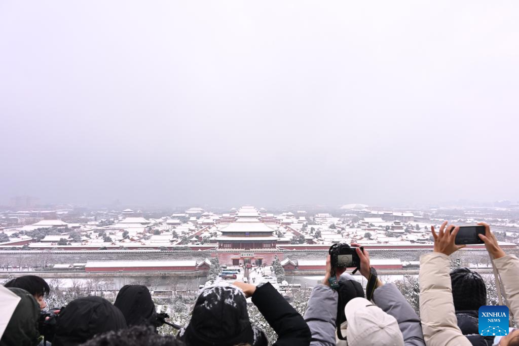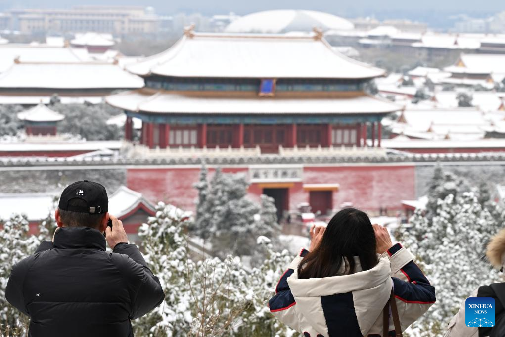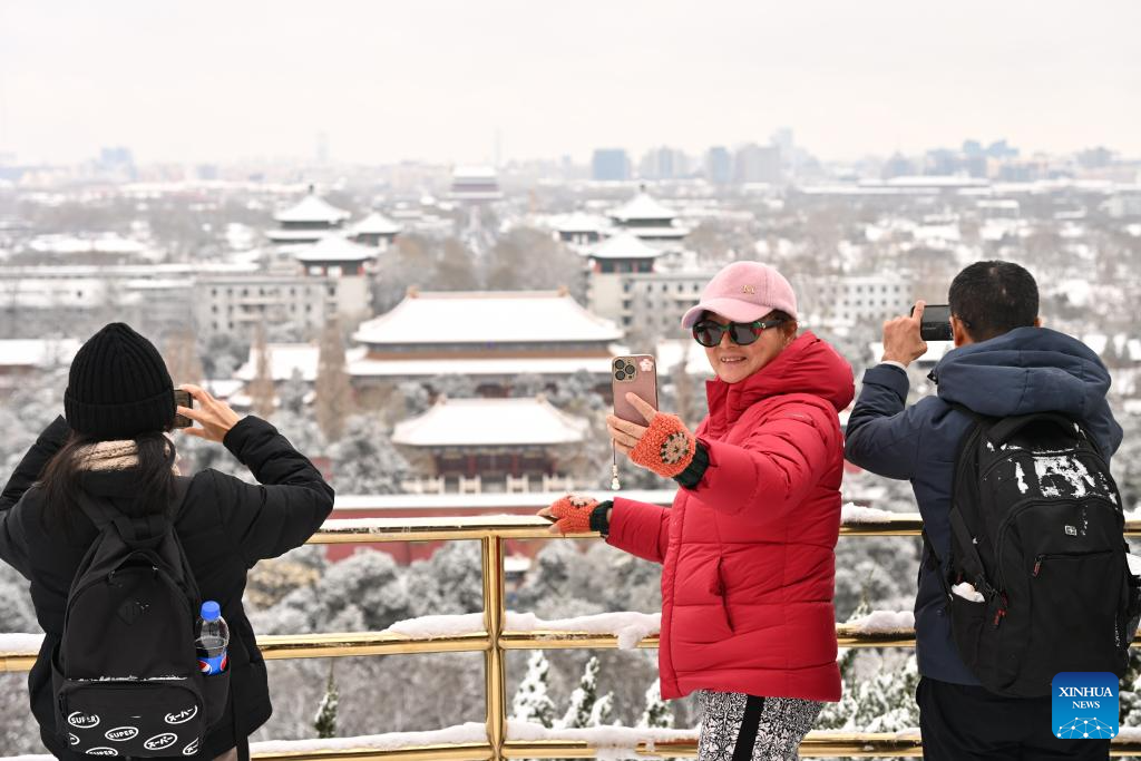 Tourists take photos amid snow at Jingshan Park in Beijing, capital of China, Dec. 11, 2023. (Xinhua/Li Xin)